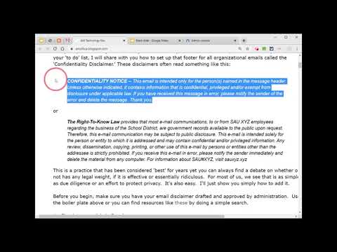 The Right-To-Know Law provides that most e-mail communications, to or from SAU XYZ employees regarding the business of the School District, are government records available to the public upon request. Therefore, this e-mail communication may be subject to public disclosure. This e-mail is intended solely for the person or entity to which it is addressed and may contain confidential and/or privileged information. Any review, dissemination, copying, printing, or other use of this e-mail by persons or entities other than the addressee is strictly prohibited. If you receive this e-mail in error, please notify the sender immediately and delete the material from any computer. For information about SAU#XYZ, visit sauxyz.xyzThis is a practice that has been considered 'best' for years yet you can always find a debate on whether or not has any legal weight, if it is effective or essentially ridiculous. For most of us, we see that is as simple as due diligence or an effort to protect privacy. It's also easy. I'll just show you simply how to add it.